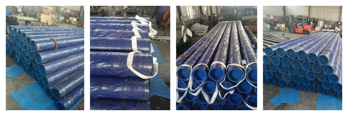 如圖所示,客戶要求這批8英寸 SCH 80 碳鋼無縫管按照每只鋼管外包一層防雨布,并且不允許多只鋼管打捆包裝,只能采用單只包裝的方式。我們完全按照客戶的要求進行打包,并且在鋼管兩端都配備了塑料管帽來保護鋼管端口不受損壞。