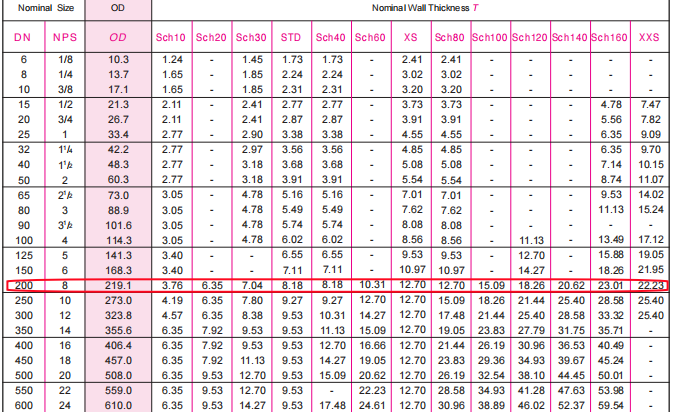 8英寸 SCH 80碳鋼無縫管,對應毫米尺寸為:外徑219.1mm,壁厚12.7mm。按照美標ASME B36.10M鋼管生產標準規(guī)定,外徑公差范圍+2.4MM,-1.6MM(221.5mm-217.5mm);壁厚公差范圍±12.5%(14.28mm-11.11mm)。
