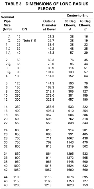 1、對(duì)焊長(zhǎng)半徑彎頭尺寸參數(shù)表