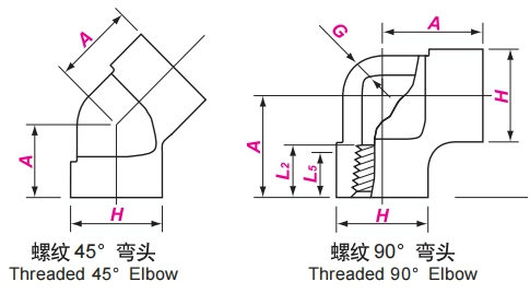 螺紋彎頭:用于改變流體流向或連接不同方向的管道,按照彎曲角度可分為90度和45度螺紋彎頭。