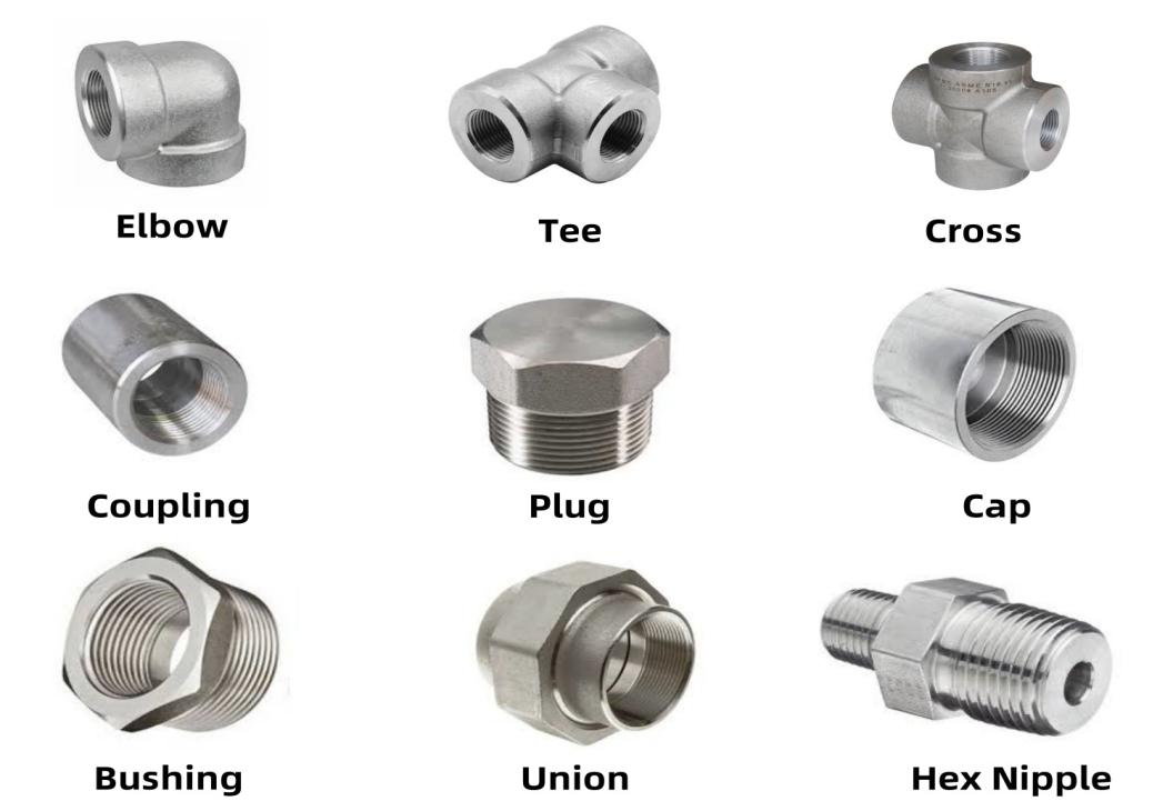 ASTM A182 螺紋管件的類型包括彎頭,三通,四通,管箍,管帽,活接頭,管塞,補(bǔ)芯,六角短節(jié),漸縮管等。
