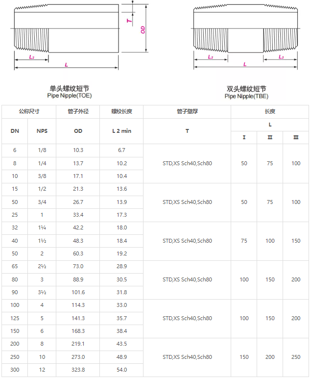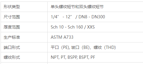 一端外螺紋另一端平口或坡口的短節(jié)稱為單頭螺紋短節(jié);兩端均為外螺紋的短節(jié)稱為雙頭螺紋短節(jié)。螺紋短節(jié)是不銹鋼短節(jié)類型中比較重要的一種,在管道應(yīng)用中,螺紋短節(jié)安裝和拆卸比都較方便,并且有多種規(guī)格可供選擇,同時又可以承受較高的壓力,適用于各種高壓流體管道和設(shè)備,可以滿足不同管道和設(shè)備的需求,因此性價比較高;在外觀上,螺紋短節(jié)保其表面平整、無裂紋、無明顯的氣孔和夾雜物等缺陷,經(jīng)久耐用。因此被廣泛應(yīng)用于各種管道和設(shè)備的連接。對應(yīng)的生產(chǎn)標(biāo)準(zhǔn)為ASTM A733。
