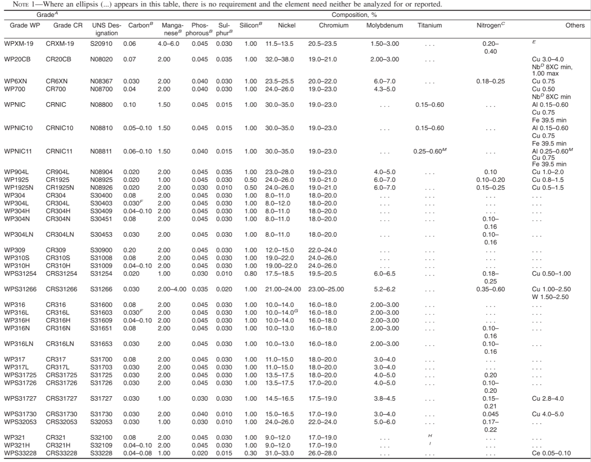 常見美標不銹鋼材質(zhì)有:ASTM A403 WP304/304L/304H, 316/316L, 310S, 317,347,904L,