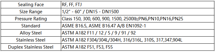ASTM A182合金鍛制法蘭的尺寸和類型各不相同,按照美標ASME B16.5和ASME B16.47生產(chǎn)標準。合金鍛制法蘭尺寸范圍可以從1/2英寸到60英寸;類型包括對焊法蘭,平焊法蘭,螺紋法蘭,承插法蘭,盲板法蘭和松套法蘭。