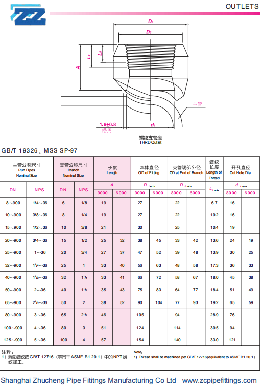 3、螺紋支管座:(Thredolet)基部與對焊支管臺相同,但是其分支連接采用螺紋連接,不需要焊接。承插支管座有3000#、6000#兩個壓力等級。