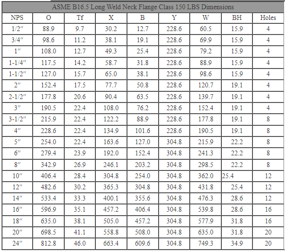 ASME B16.5 CLASS150 長(zhǎng)頸對(duì)焊法蘭尺寸表